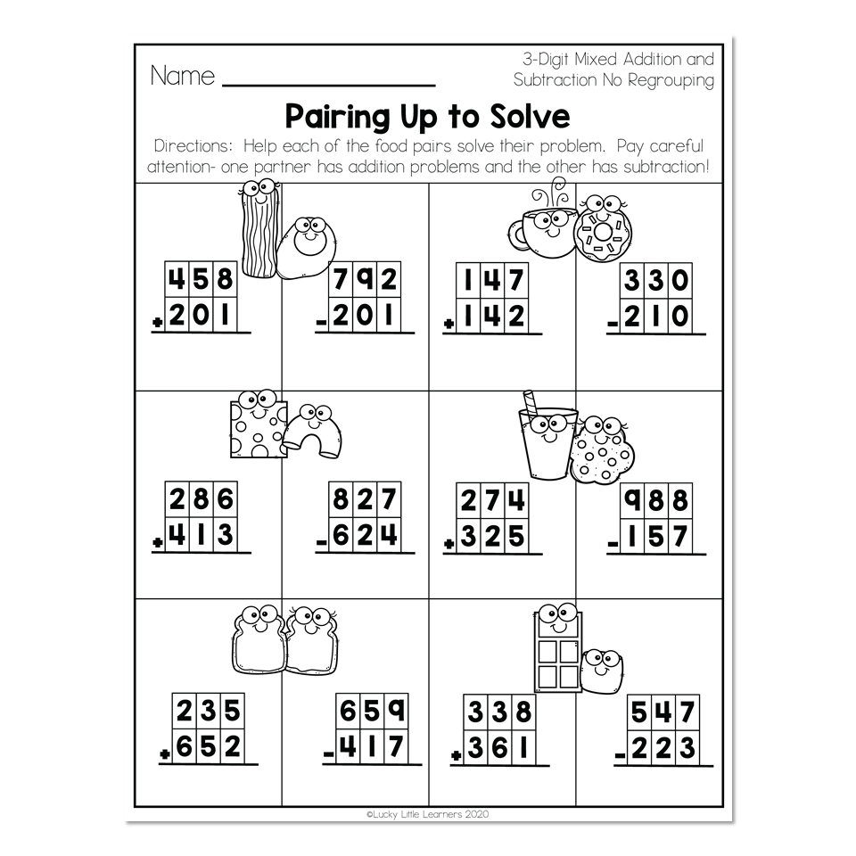 2nd Grade Math Worksheets 3 Digit Mixed Addition And Subtraction No Regrouping Pairing Up To Solve Lucky Little Learners