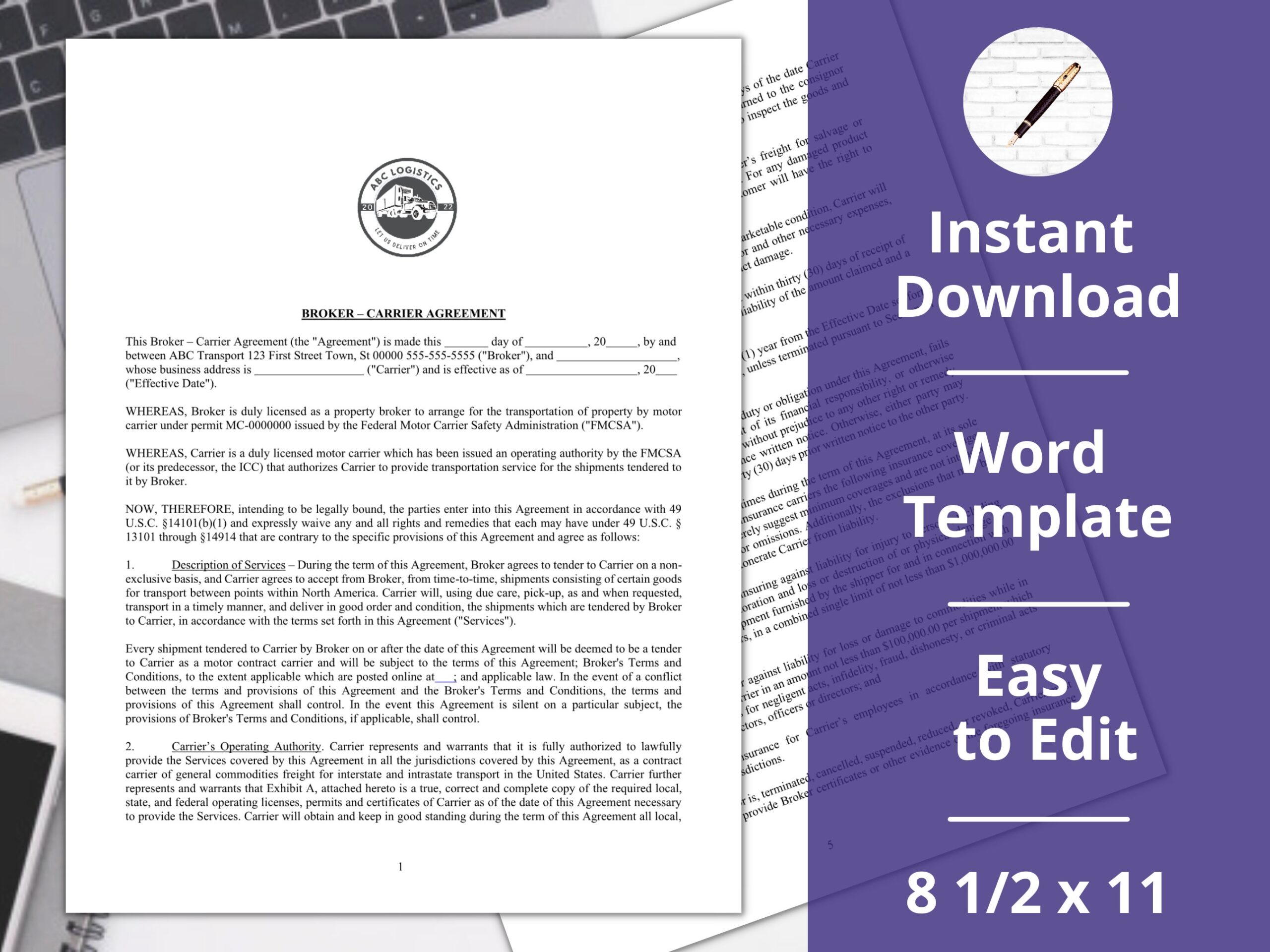 Broker carrier Agreement contract instant Download template microsoft Word Etsy
