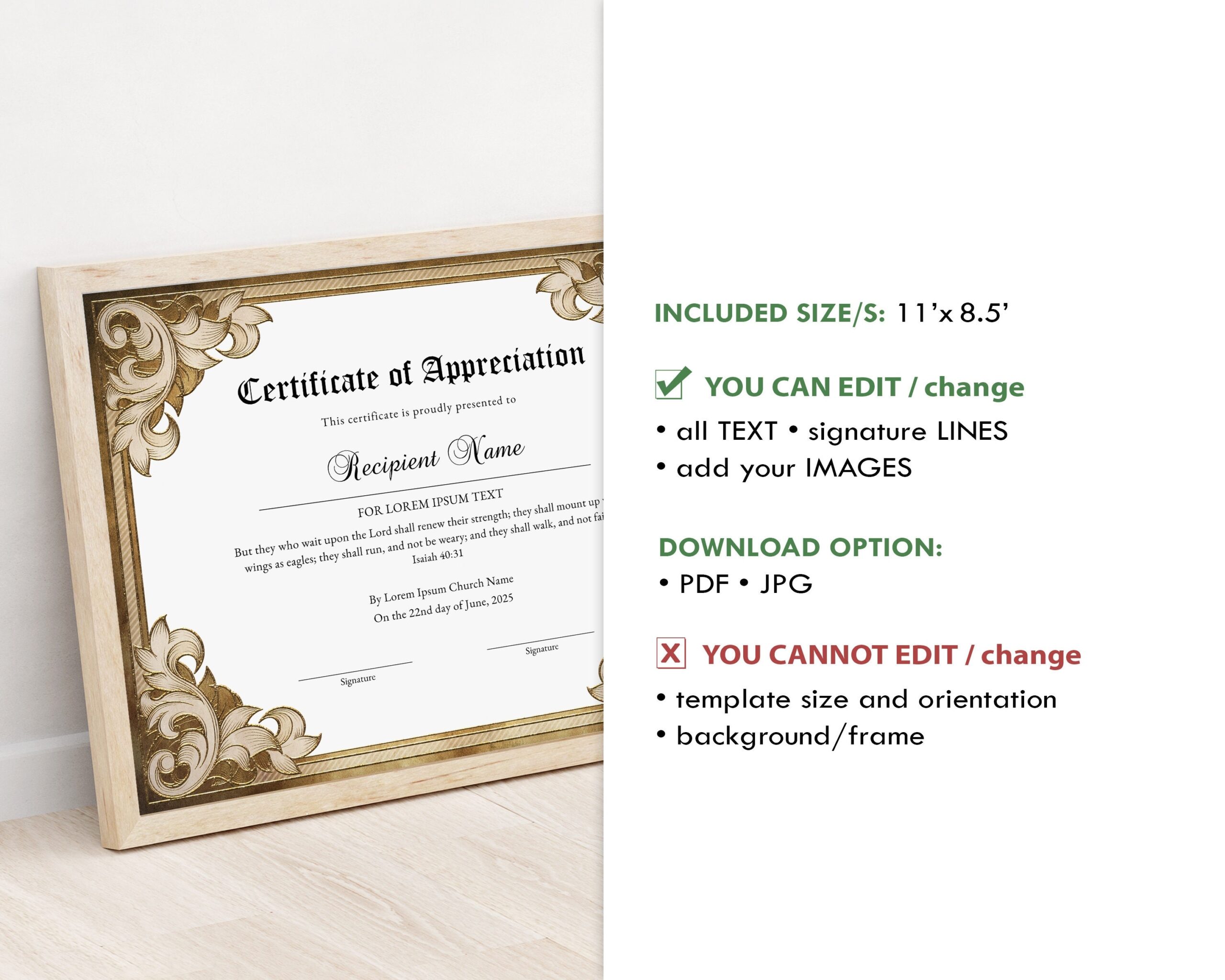 Editable Appreciation Certificate Template Printable Church Certificate Of Appreciation Bible Verse Isaiah 40 31 Digital Download Jet253 Etsy Israel