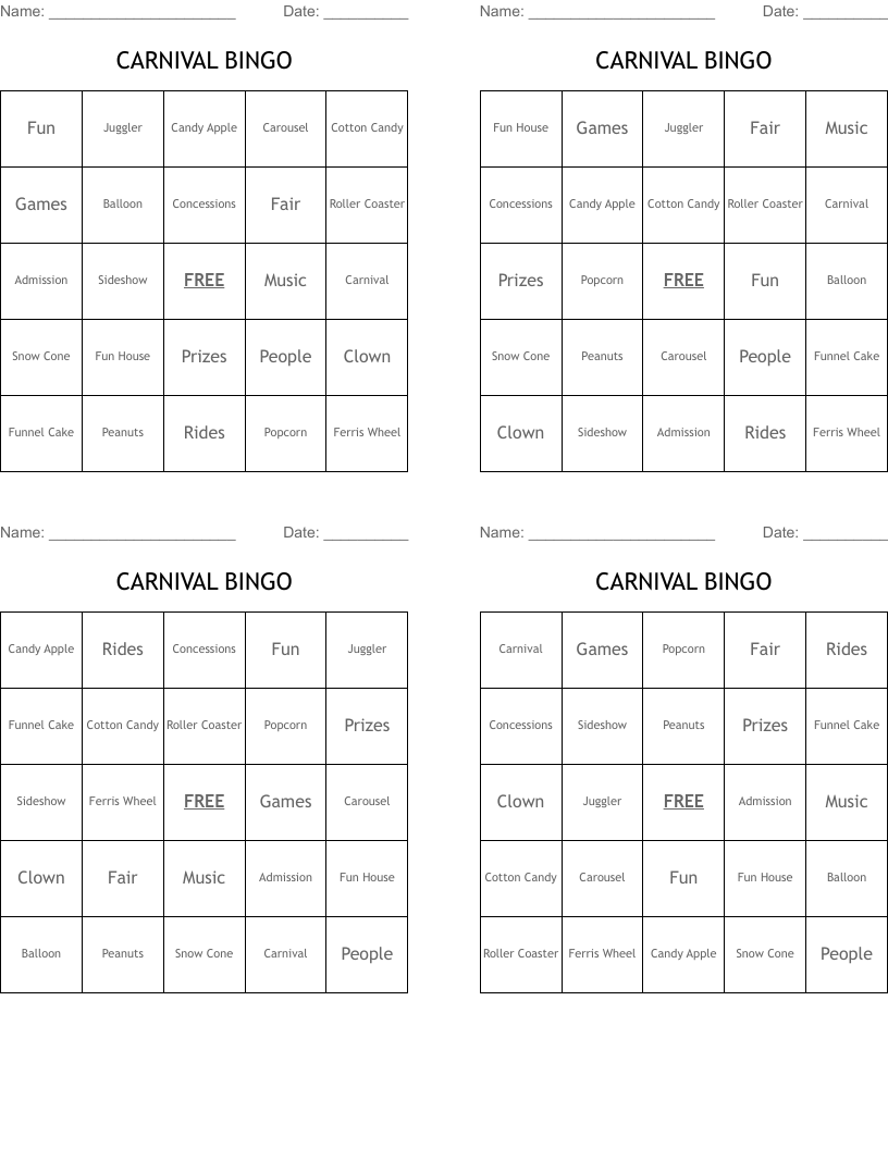 Free Printable Carnival Bingo Cards