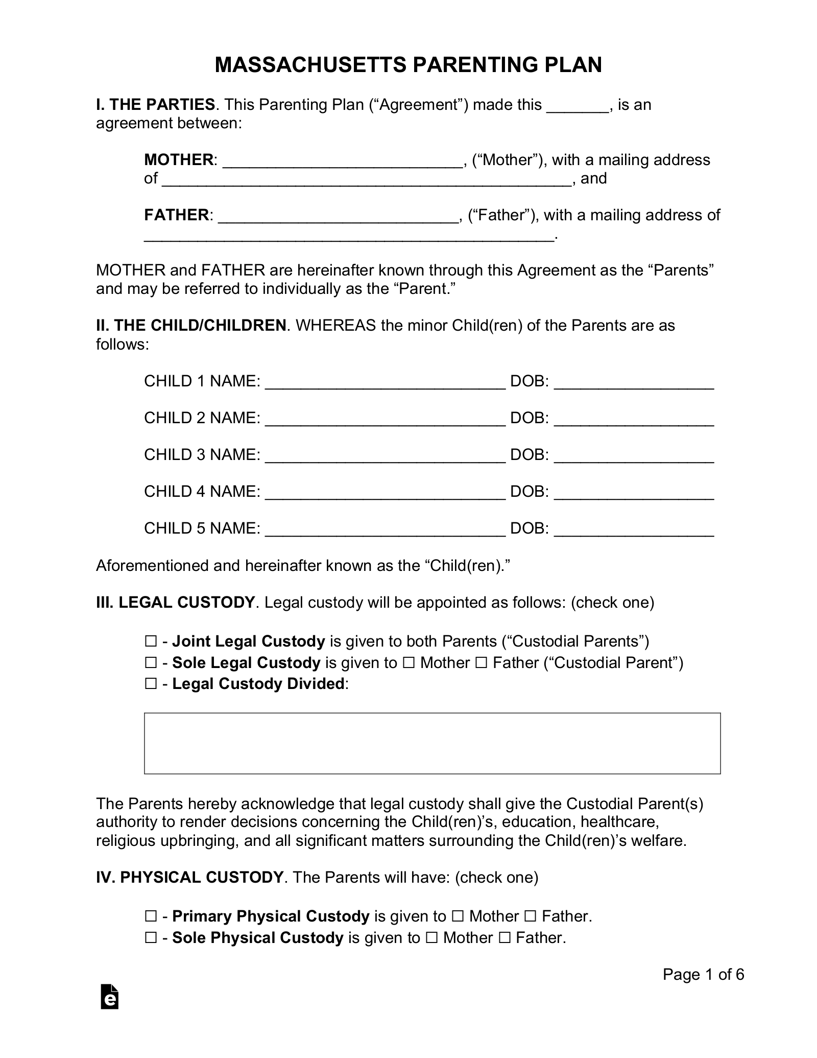 Free Massachusetts Custody Parenting Plan PDF Word EForms