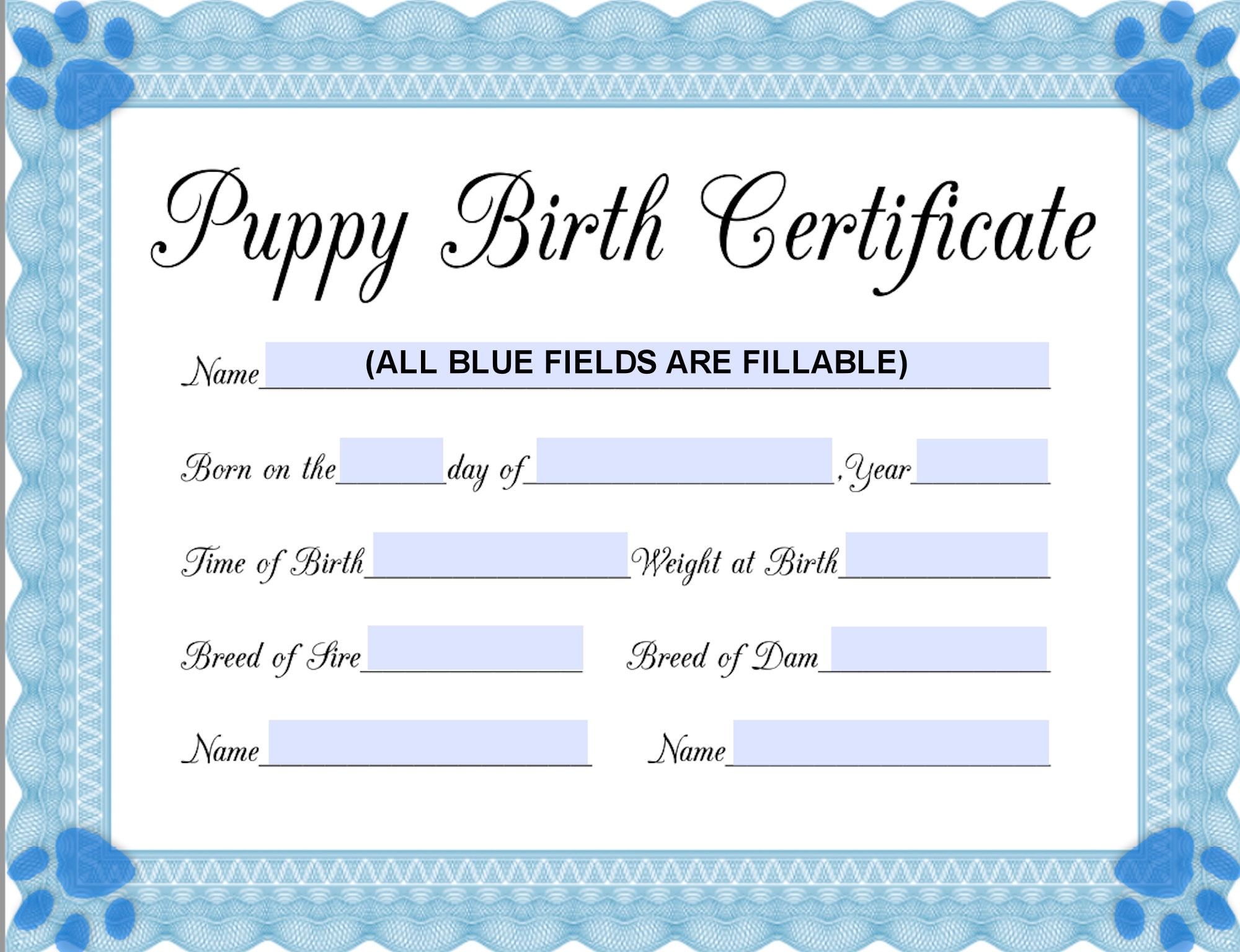 INSTANT Fillable Printable PDF Puppy Birth Certificate blue male Printable 8 5×11 4950px3825px450dpi Jpg BOTH Included Etsy