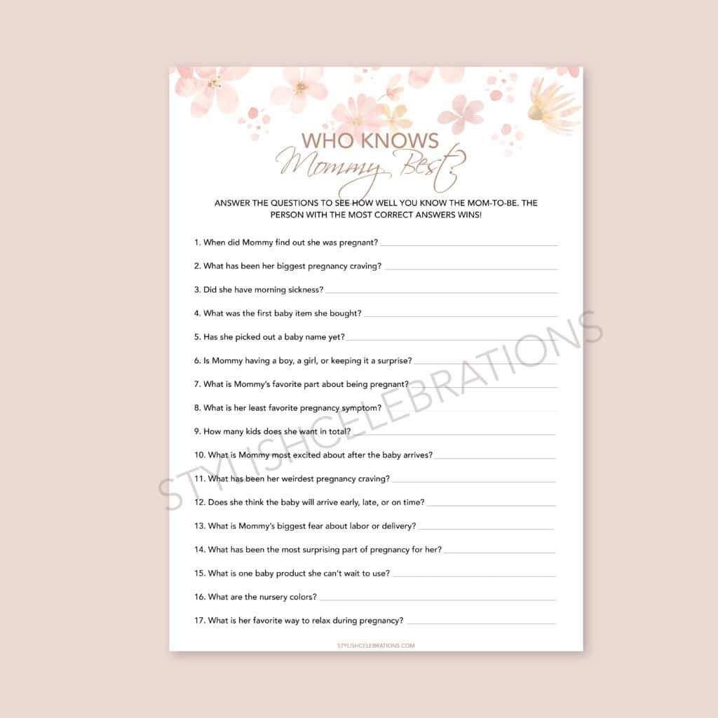 One of the best things about this game is that you can easily find free printable “Who Knows Mommy Best” questions online. These printables come in various themes and designs, making it easy to match the game to your shower’s decor or the mom-to-be’s preferences.