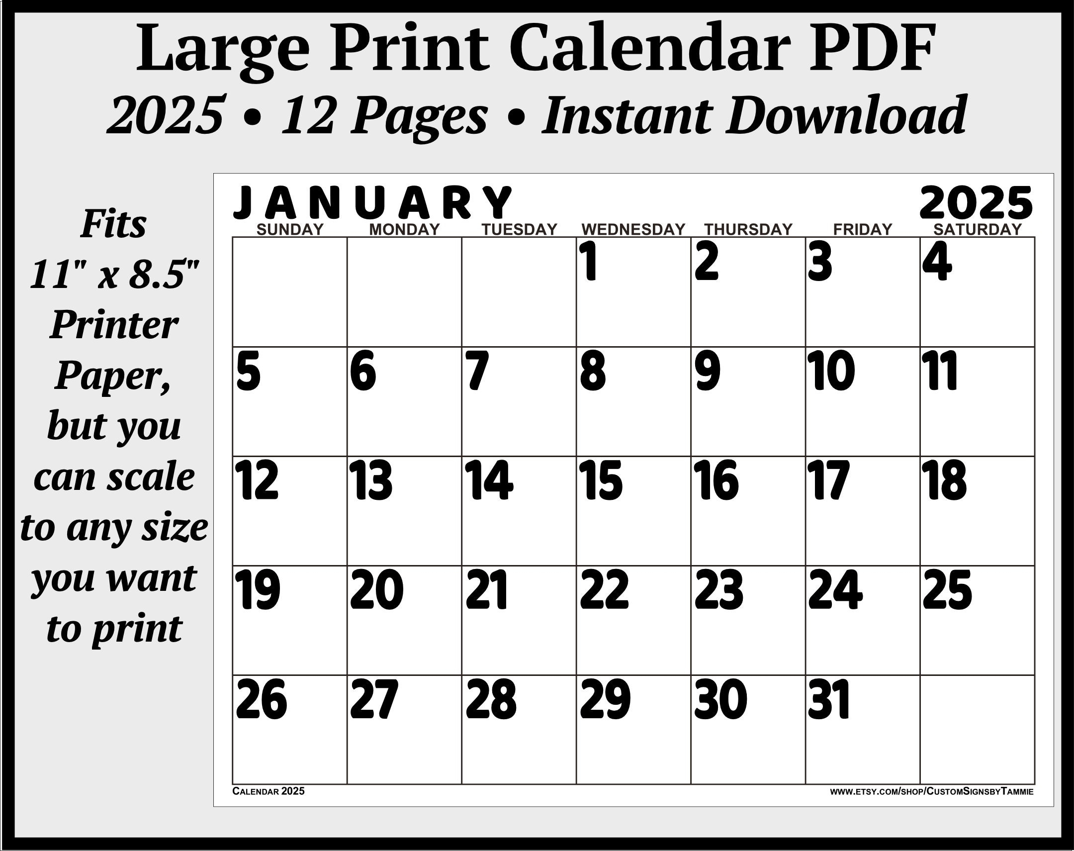 2025 Calendar PDF With Large Print Big Bold Numbers Instant Digital Download Etsy