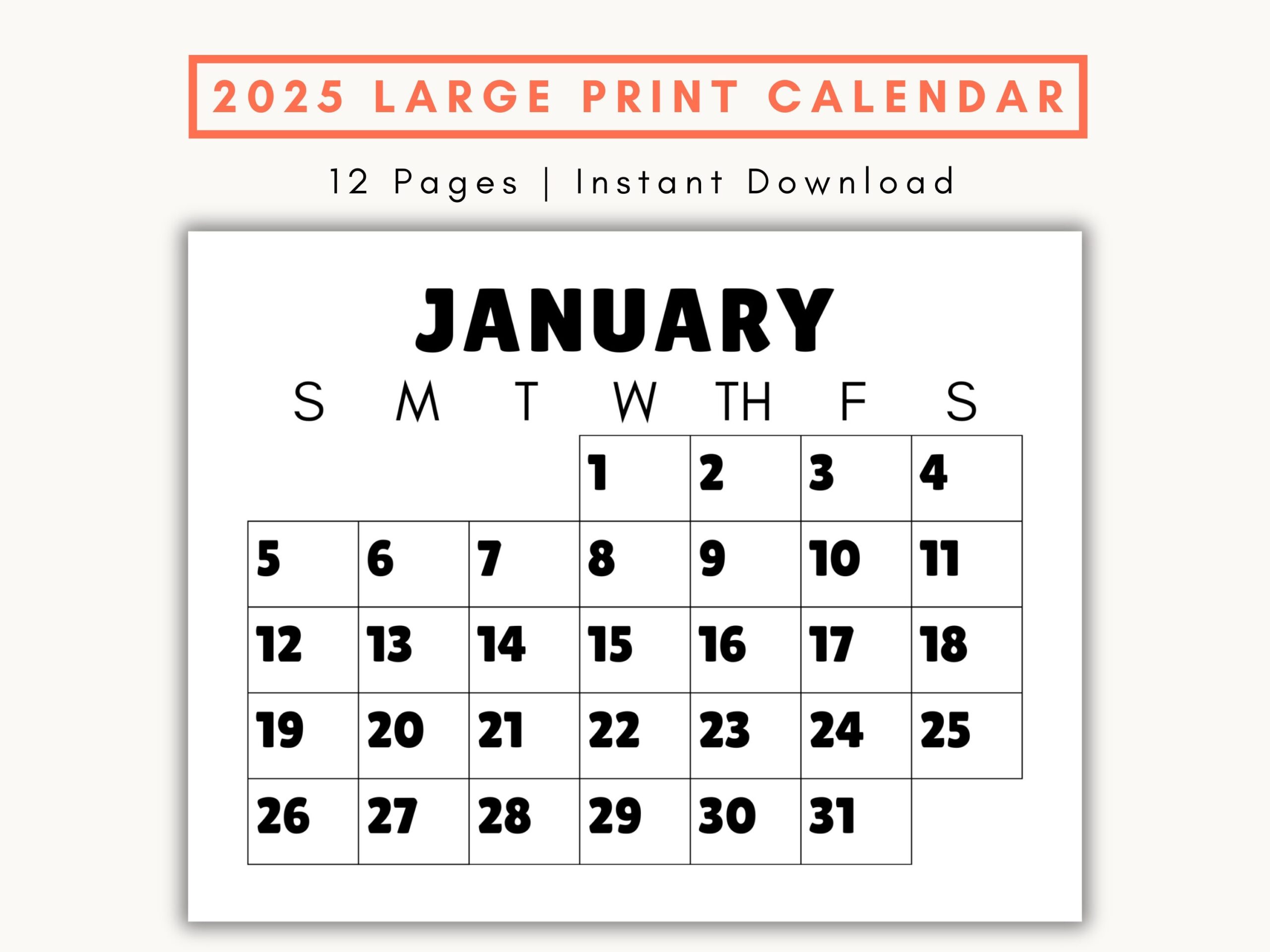 Large Print Monthly Calendar 2025 Senior Citizen Calendar With Large Numbers Sunday Start Printable PDF Etsy