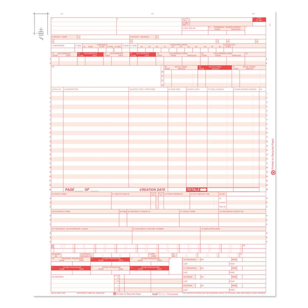 HCFA CLAIM FORM 1450 UB04 LASER CUT WHITE AND RED 2500 PER BOX