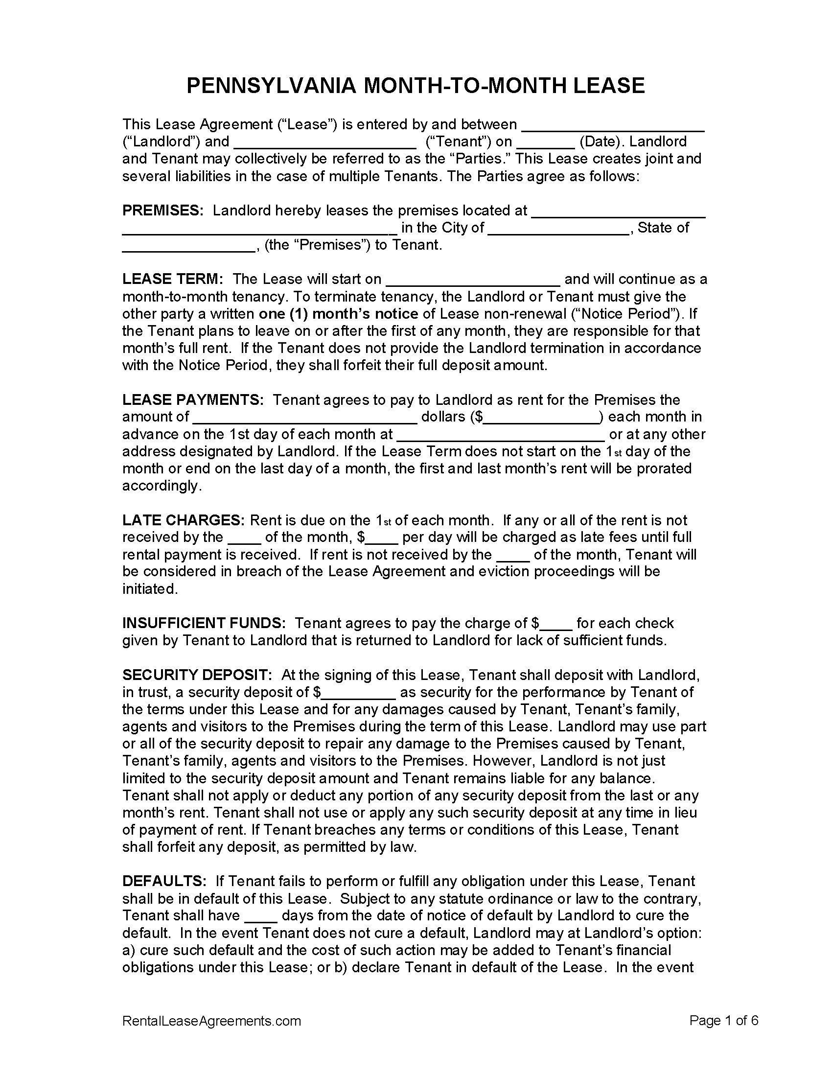 Free Pennsylvania Month To Month Rental Agreement PDF MS Word